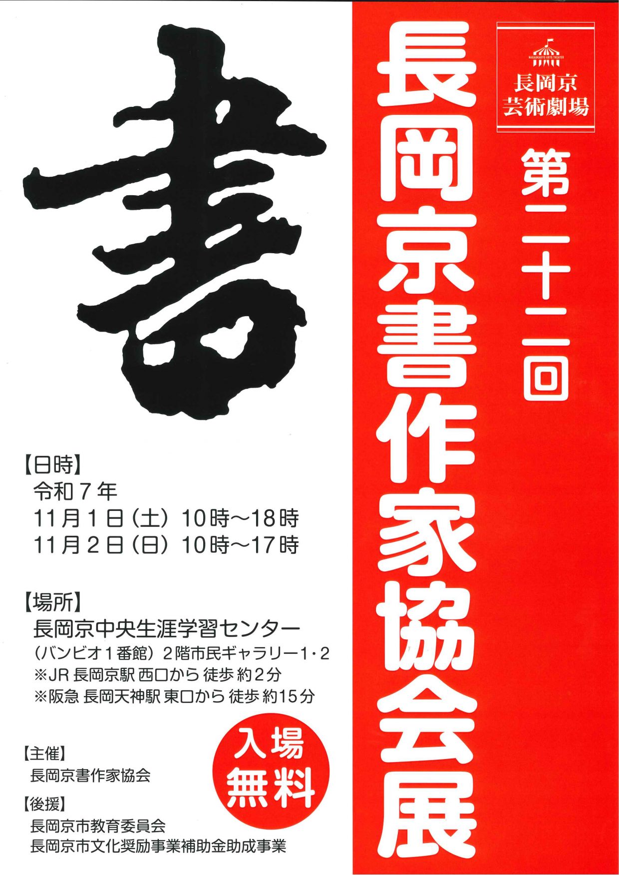 2025-09-21 / 最終更新日時 : 2025-09-21 nagaokasaposen 02.登録団体イベント情報 【作品展】11/1、11/2 「第22回 長岡京書作家協会展」 長岡京書作家協会 第22回 長岡京書作家協会展 【日時】11月1日(土) 10時~18時 / 11月2日 (日) 10時~17時 【場所】長岡京中央生涯学習センター バンビオ1番館 2階 市民ギャラリー1、2 【主催】長岡京書作家協会