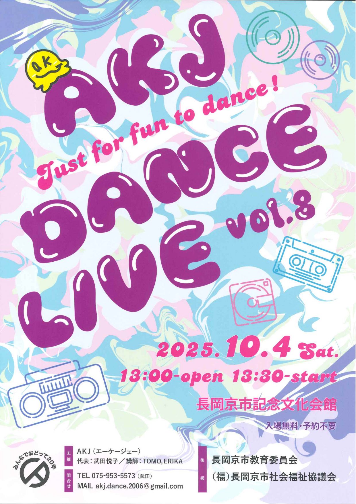 2025-09-24 / 最終更新日時 : 2025-09-24 nagaokasaposen 02.登録団体イベント情報 【イベント】10/4 「AKJ DANCE LIVE vol.8」 AKJ Just for fun to dance ! 【日時】10月4日(土) 開場:13時 開演:13時30分~ 【場所】京都府長岡京市記念文化会館 大ホール (入場無料・予約不要) 【主催】AKJ(エーケージェー) 【後援】長岡京市教育委員会 (福)長岡京市社会福祉協議会 【お問い合わせ】TEL:075-953-5573 MAIL:akj.dance.2006@gmail.com