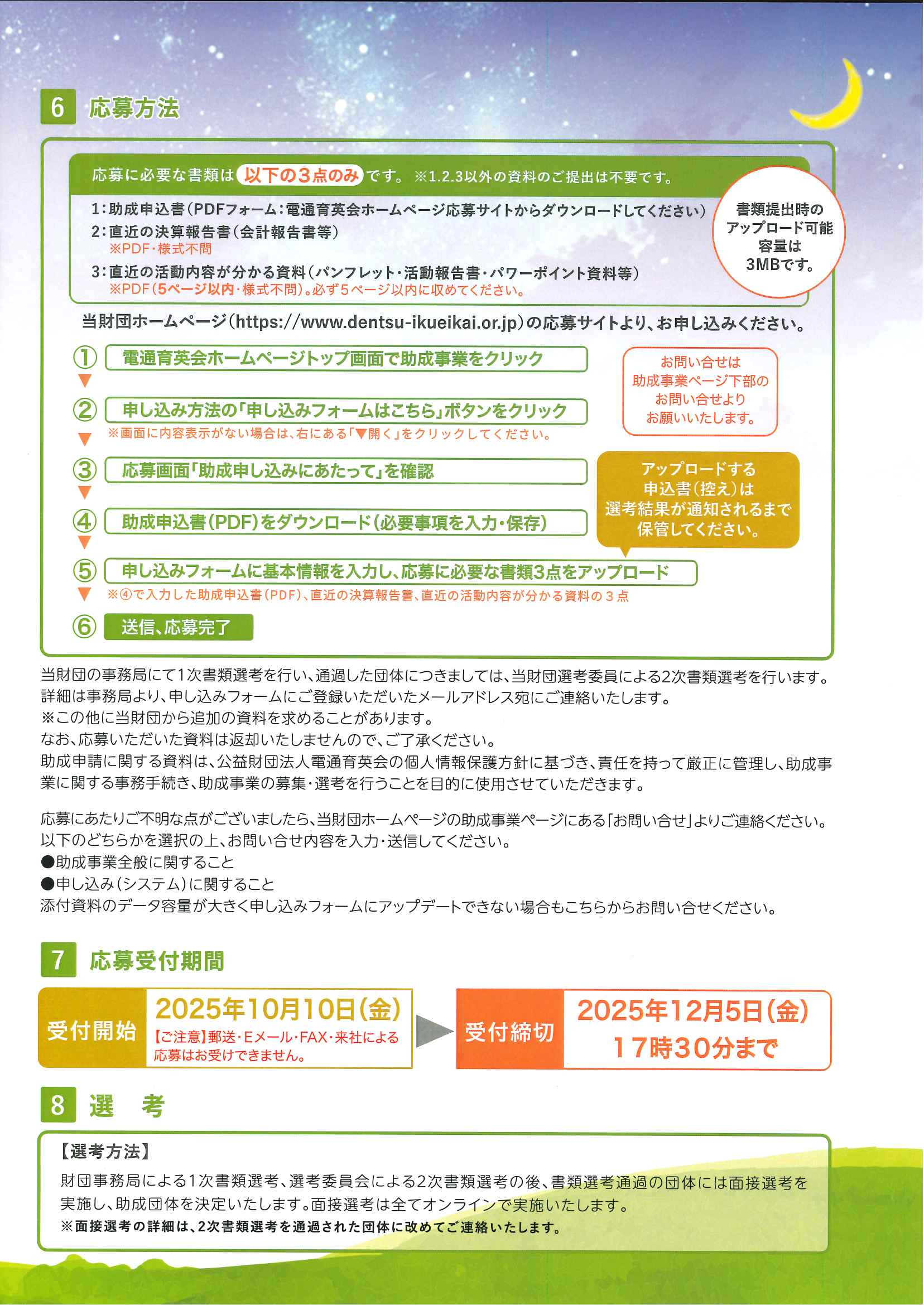 当財団ホームページ(https://www.dentsu-ikueikai.or.jp)の応募サイトより、お申し込みください。申し込み手順は添付の募集要項をご確認ください。
