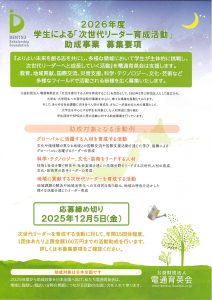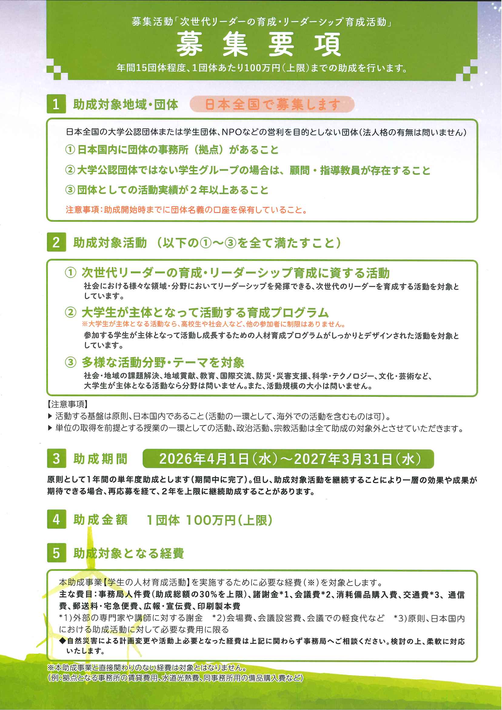 2026年度 学生による「次世代リーダー育成活動」助成団体募集のご案内 をご覧ください。