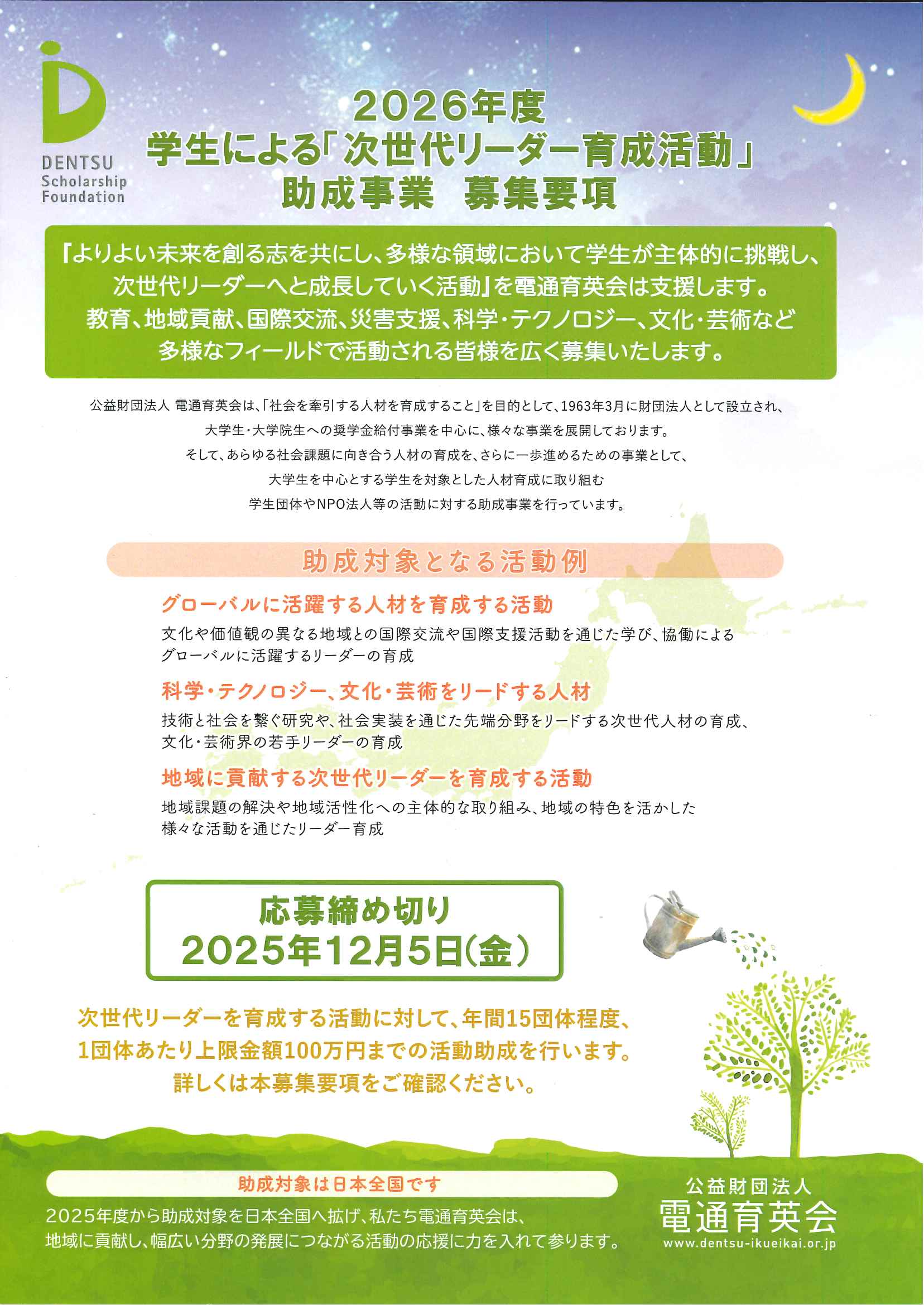 10/10~12/5(金) 2026年度 学生による「次世代リーダーの育成活動」助成事業 募集要項 公益財団法人 電通育英会