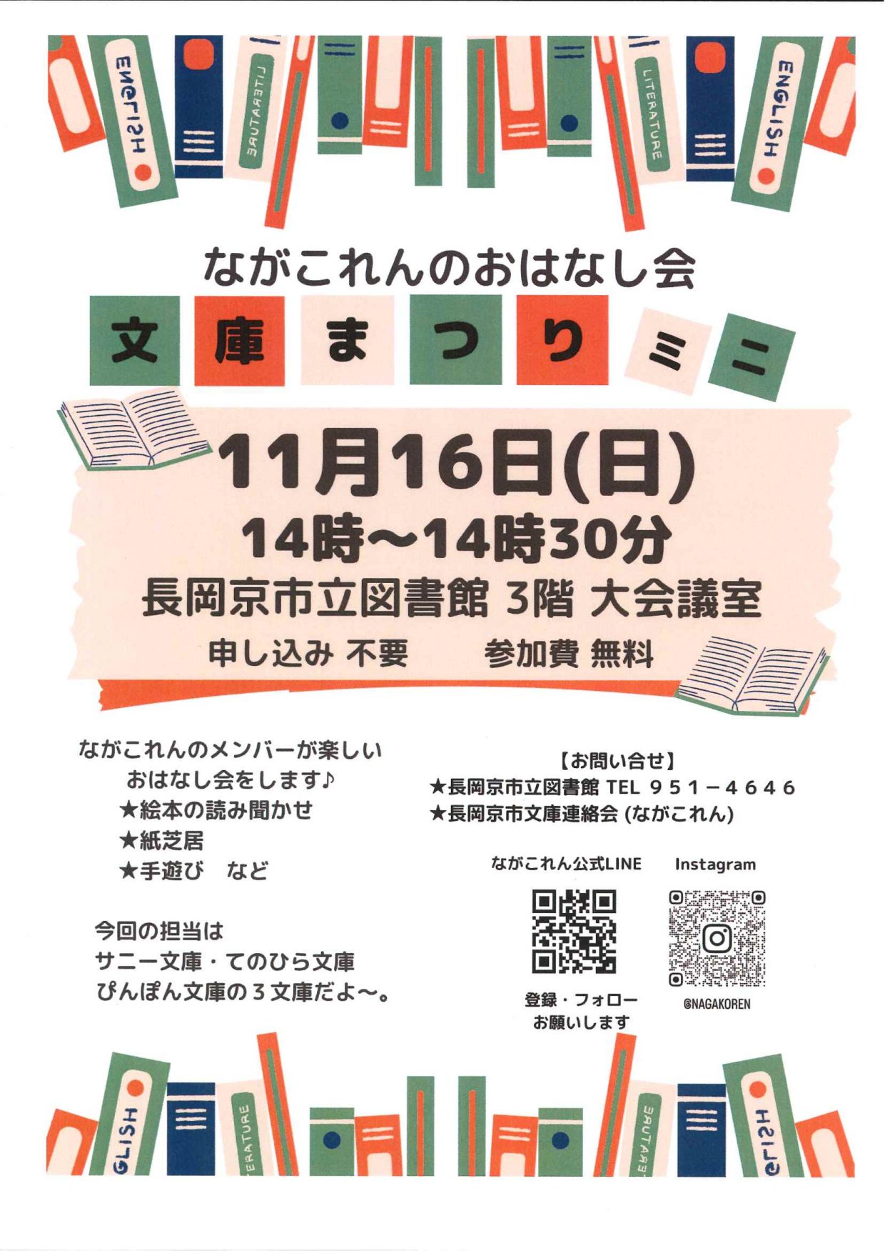 2025-10-27 / 最終更新日時 : 2025-10-27 nagaokasaposen 02.登録団体イベント情報 【イベント】11/16(日)おはなし会「文庫まつりミニ」 長岡京市文庫連絡会 ながこれんのメンバーが、楽しいおはなし会をします♪ 絵本の読み聞かせ、紙芝居、手遊びなど。 今回の担当は、サニー文庫、てのひら文庫、ぴんぽん文庫の3文庫だよ~。 日 時:2025年11月16日(日) 14時~14時30分 場 所:長岡京市立図書館 3階大会議室 申 込:不要 参加費:無料 お問い合わせ:長岡京市文庫連絡会(ながこれん)公式LINE、長岡京市立図書館 ★詳細はチラシをご覧ください。チラシは、サポセン配架コーナーにも置いています。