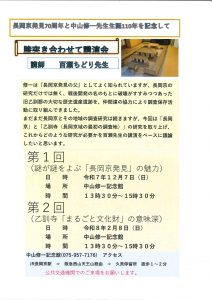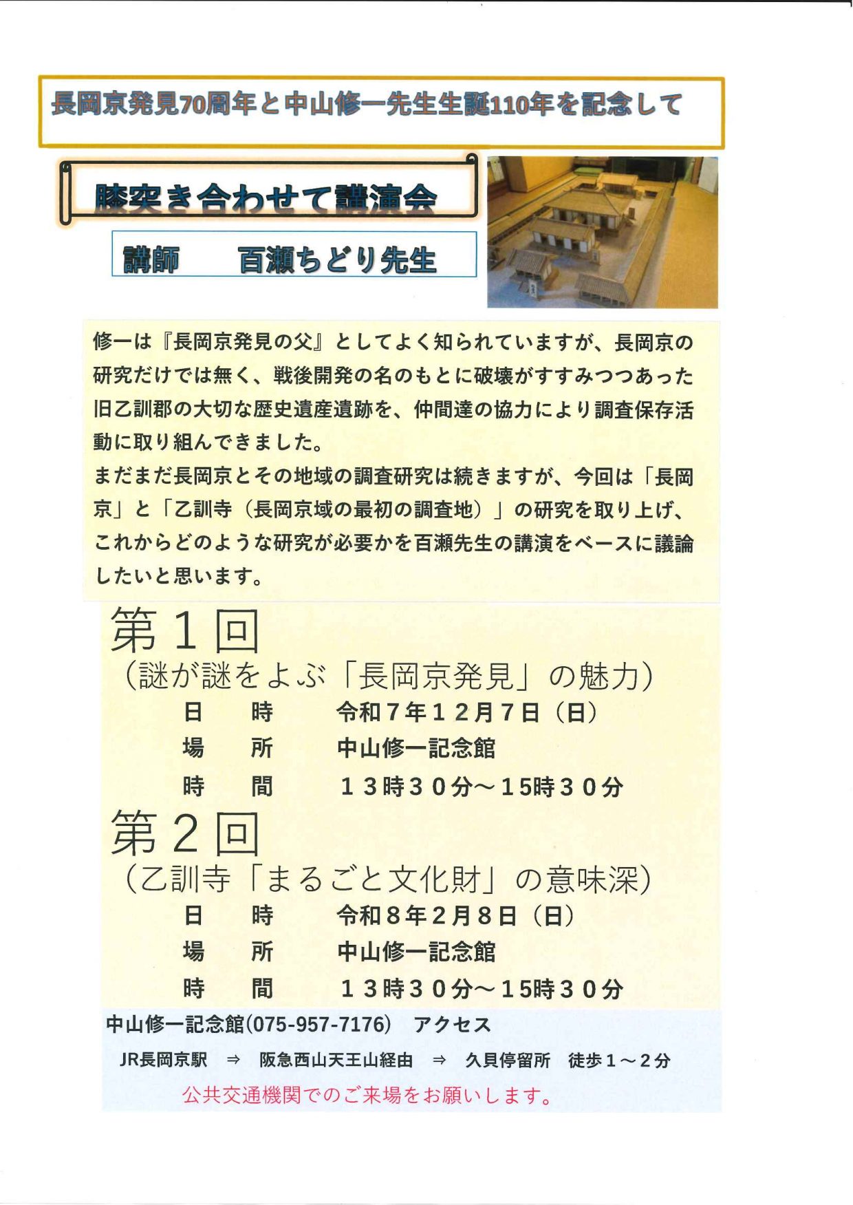 2025-11-15 / 最終更新日時 : 2025-11-15 nagaokasaposen 02.登録団体イベント情報 【講演会】12/7、2/8 「膝突き合わせて講演会」 NPO法人長岡京市ふるさとガイドの会 長岡京発見70周年と中山修一先生生誕110年を記念して ◇第1回 謎が謎をよぶ「長岡京発見」の魅力◇ 【日時】令和7年12月7日(日) 13:30~15:30 【場所】中山修一記念館 ◇第2回 乙訓寺「まるごと文化財」の意味深 【日時】令和8年2月8日(日) 13:30~15:30 【場所】中山修一記念館 ☆詳細はチラシをご覧ください。チラシはサポセン配架コーナーにも置いています。