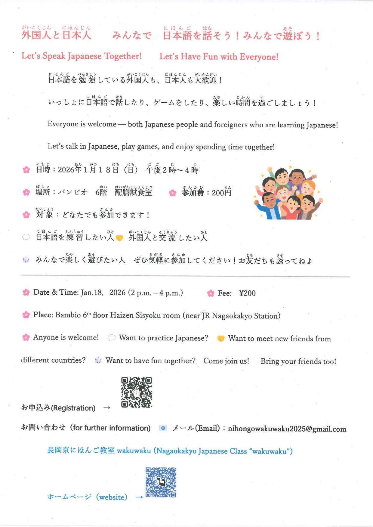 いっしょに日本語で話したり、ゲームをしたり、楽しい時間を過ごしましょう!