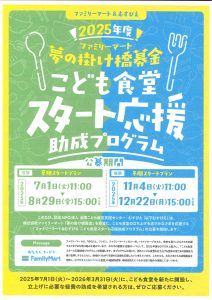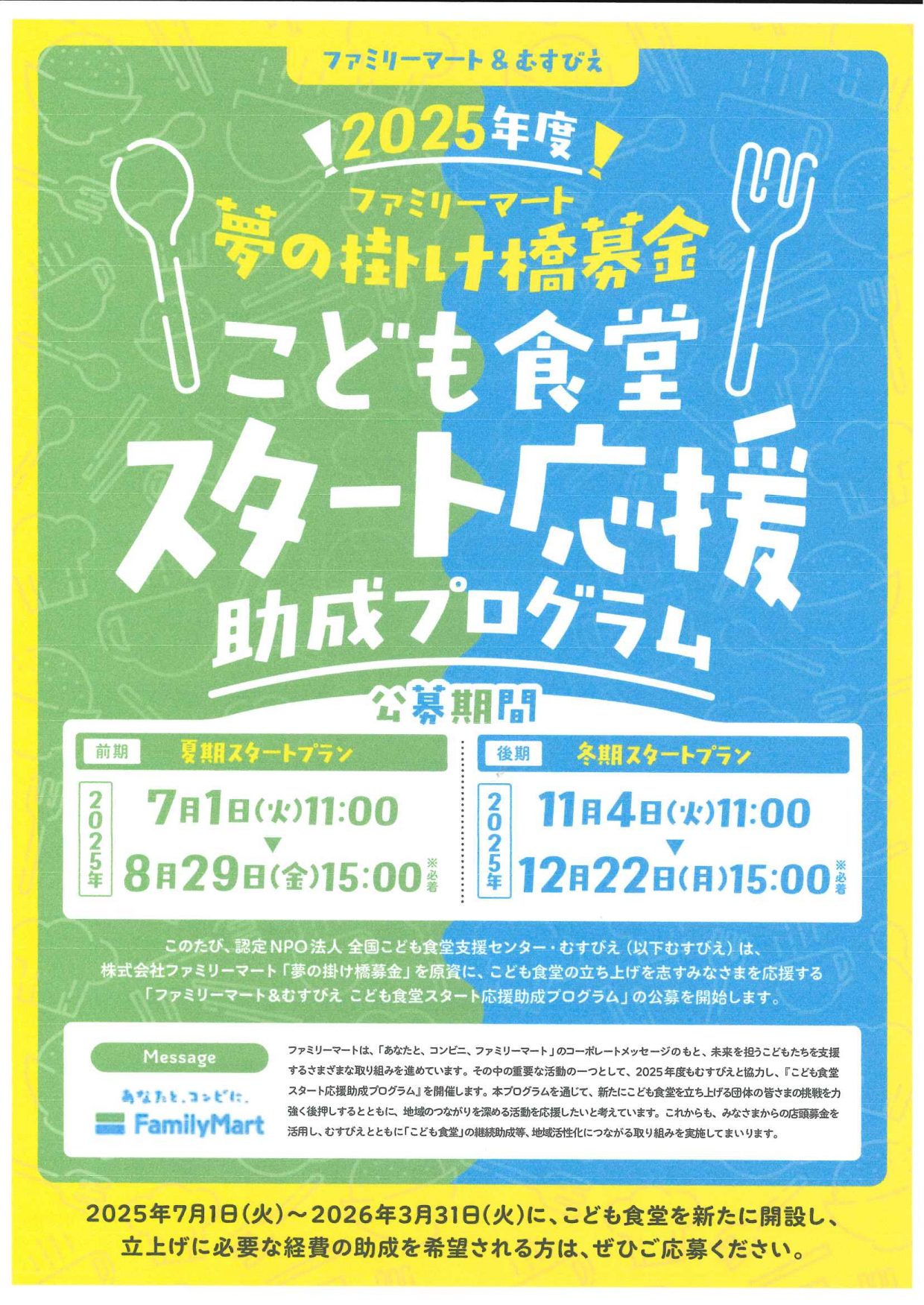 【助成金】~12/22 「2025年度ファミリーマート夢の掛け橋募金子ども食堂スタート応援助成プログラム」 NPO法人全国こども食堂支援センター・むすびえ