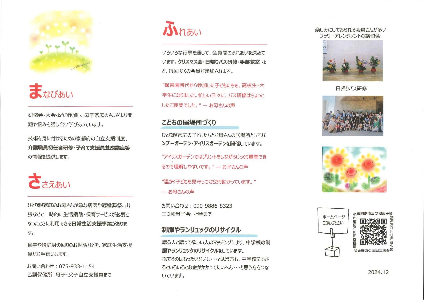 母子家庭や寡婦の人が子育てや生活の悩み事を話し合ったり、助け合ったりしながらお互いの幸せを高めるために作られた会です。