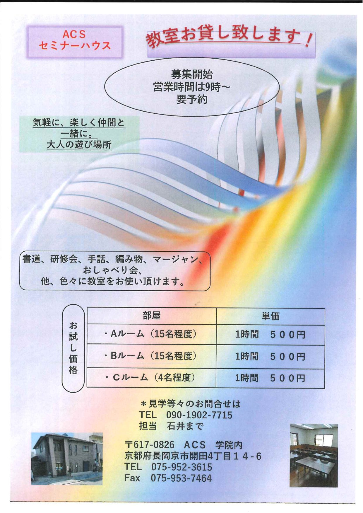 2026-02-22 / 最終更新日時 : 2026-02-22 nagaokasaposen 03-1.子育て関連 【募集】「教室お貸し致します!」 A.C.Sセミナーハウス 気軽に、楽しく仲間と一緒に。大人の遊び時間 書道、研修会、手話、編み物、マージャン、他、色々に教室をお使い頂けます。 【募集開始】営業時間は9時~(要予約) ※見学等々のお問合せはTEL:090-1902-7715 担当:石井まで 〒617-0826 A.C.S学院内 京都府長岡京市開田4丁目14-6 TEL:075-952-3615 FAX:075-953-7464
