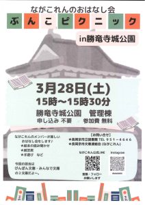 2026-03-09 / 最終更新日時 : 2026-03-09 nagaokasaposen 02.登録団体イベント情報 【イベント】3/28(土) ぶんこピクニック in 勝竜寺城公園 長岡京市文庫連絡会 ながこれんのメンバーが、楽しいおはなし会をします♪ 絵本のよみきかせ、紙芝居、手遊びなど。 今回の担当は、ぴんぽん文庫・みんなで文庫の2文庫だよ~。 日 時:2026年3月28日(土) 15時~15時30分 場 所:勝竜寺城公園 管理棟 申し込み:不要 参加費:無料 主催:長岡京市文庫連絡会 お問い合わせ:ながこれん公式LINE・Instagramへ ★詳細はチラシをご覧ください。チラシは、サポセン配架コーナーにも置いています。