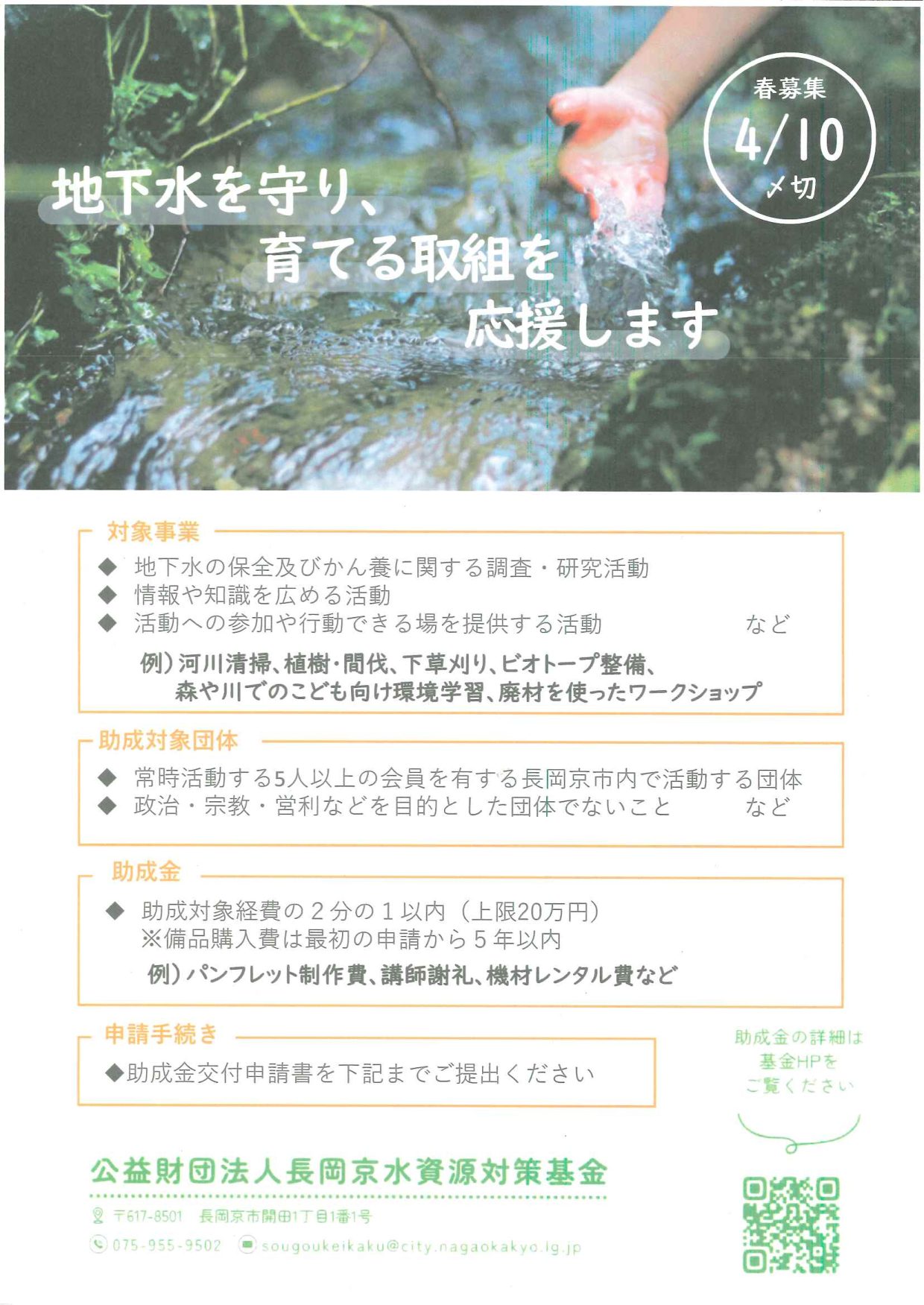 【助成金】~4/10 地下水を守り、育てる取組を応援します 公益財団法人長岡京水資源対策基金