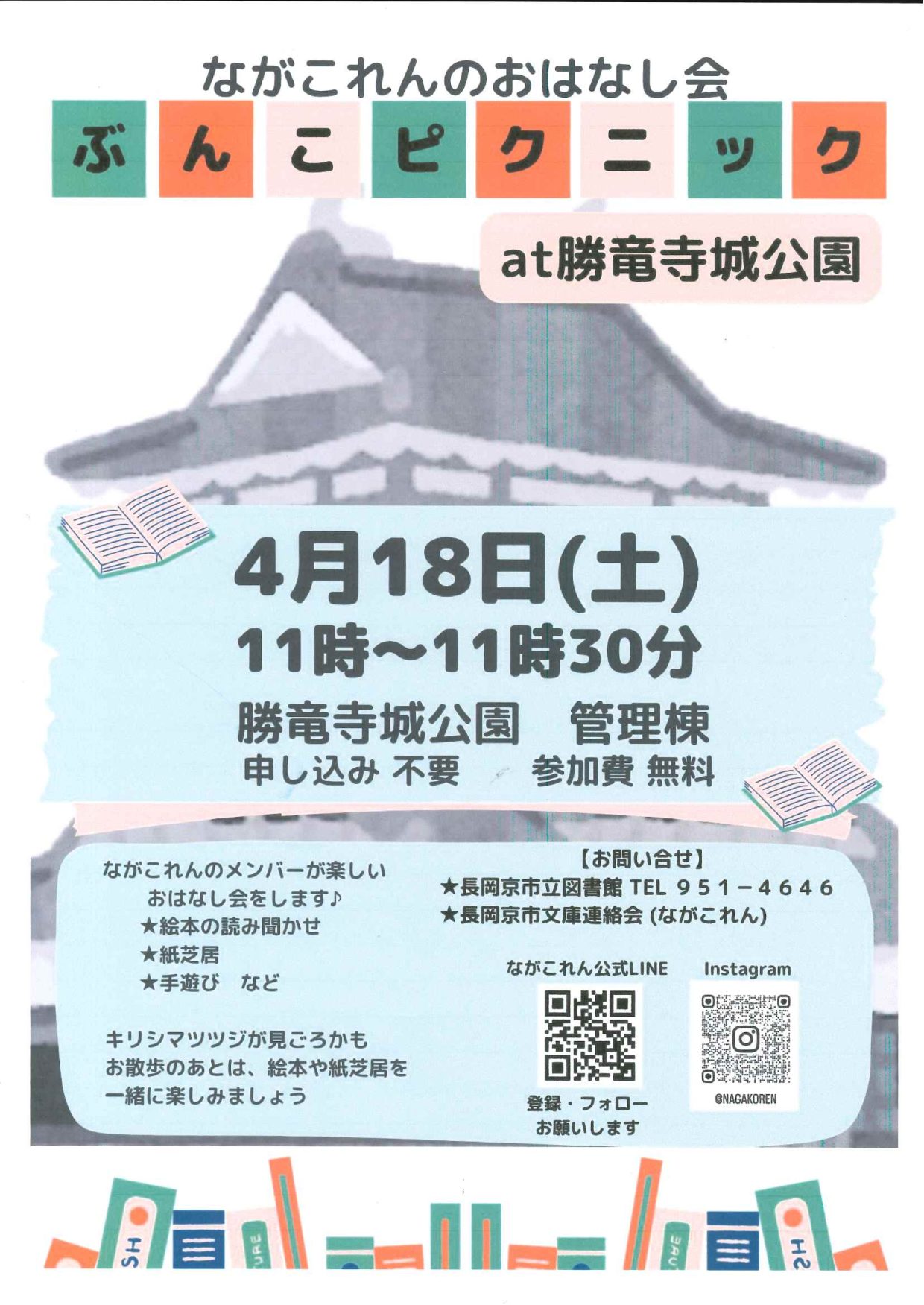 【イベント】4/18(土) ぶんこピクニック at勝竜寺城公園 長岡京市文庫連絡会