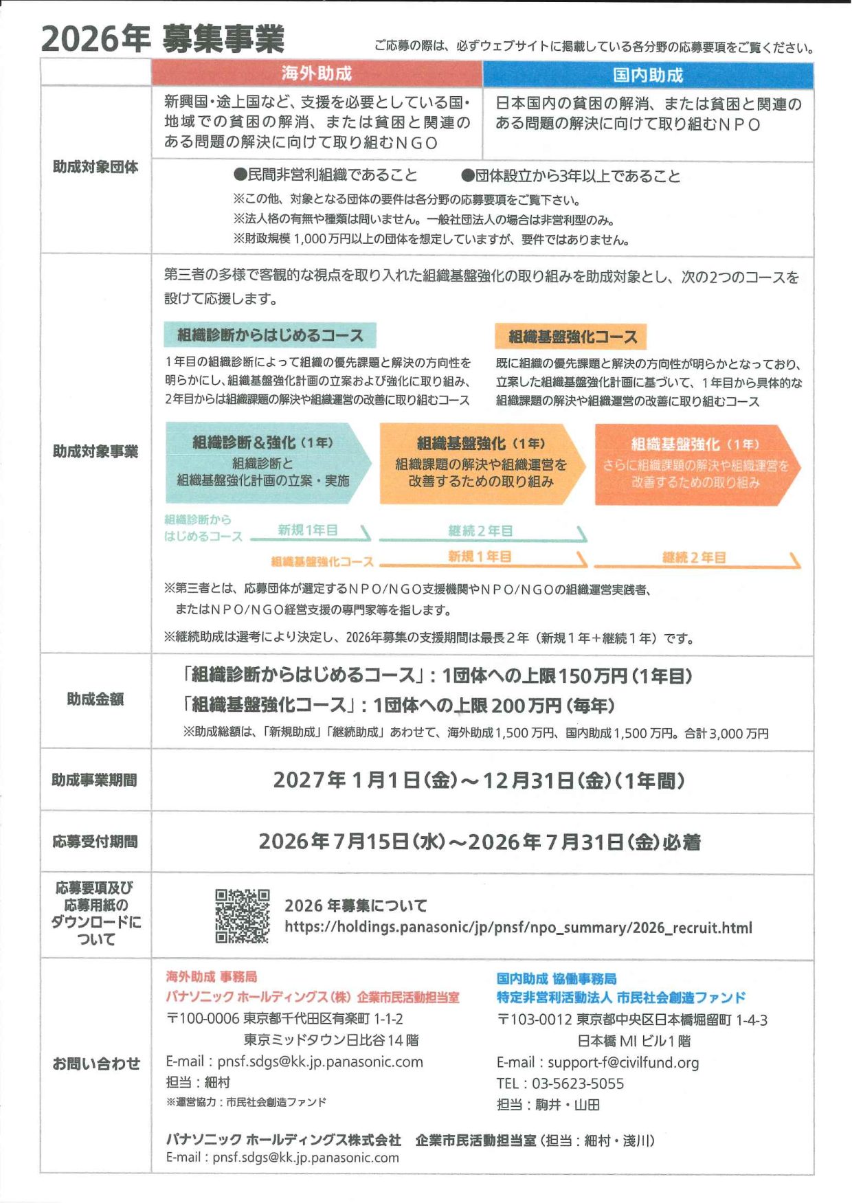 ※継続助成は選考により決定し、2026年募集の支援期間はいずれのコースも最長2年(新規1年+継続1年)です。