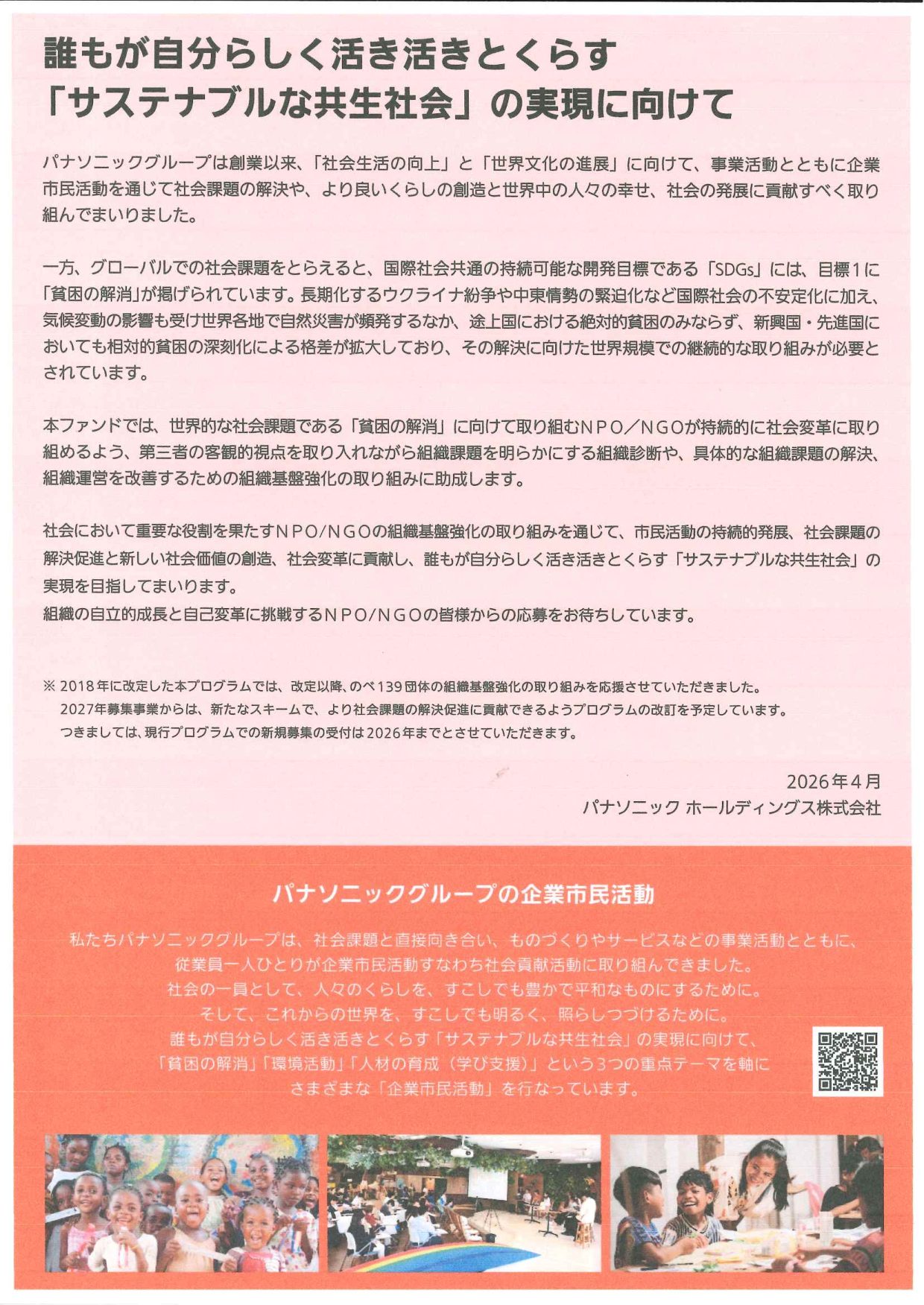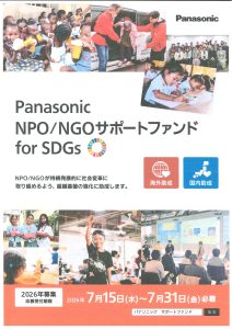【助成金】令和8年 7/15(水)~7/31(金)「Panasonic NPO/NGOサポートファンドfor SDGs」