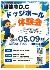 2026-04-26 / 最終更新日時 : 2026-04-26 nagaokasaposen 02.登録団体イベント情報 【体験会】5/9(土) ドッジボール体験会 勝龍寺D.C はじめてでも大丈夫!ドッジボール大好きな子集まれ! 【日時】5月9日(土) 9:00~11:00 【場所】長岡第八小学校 体育館 【対象】小学1年生~6年生の男女 【持ち物】動きやすい服装、タオル、上靴、飲み物 ☆予約不要! ☆問い合わせはHP・Instagramへ (チラシ記載のQRコードよりどうぞ)