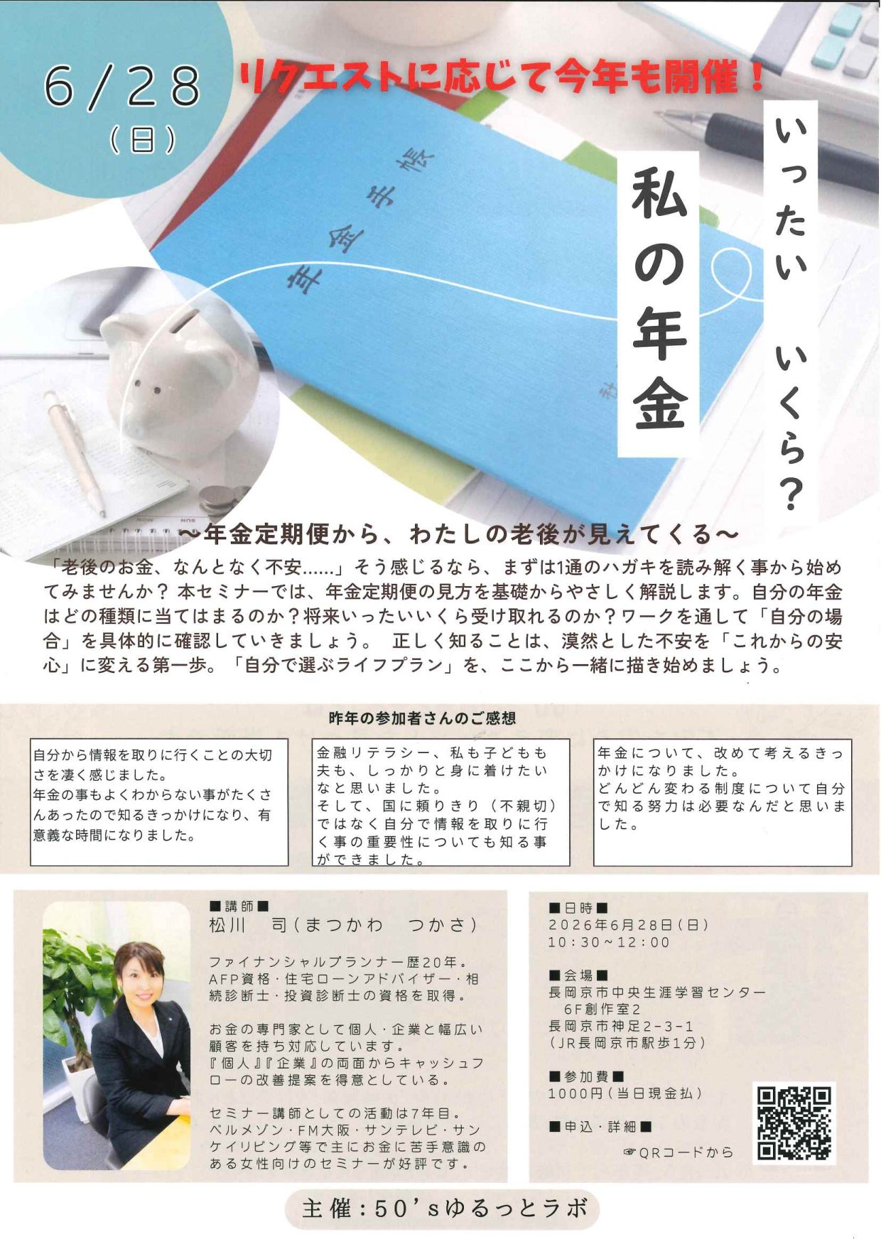 【セミナー】6/28 「いったい いくら?私の年金」 50❜sゆるっとラボ